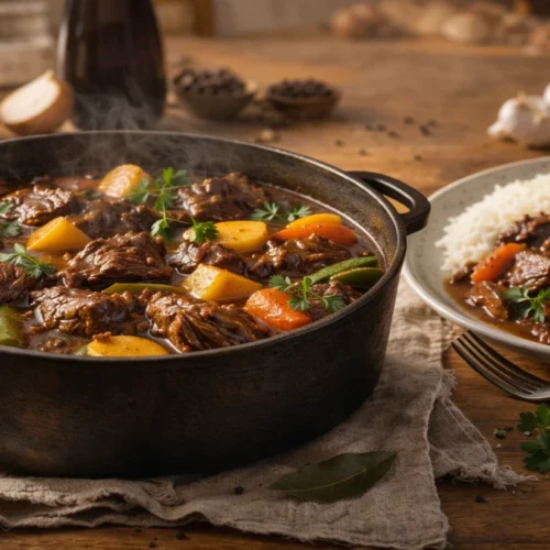 Substitua as batatas por mandioca (aipim ou macaxeira) cortada em pedaços grandes de 4-5cm. A mandioca tem sabor mais marcante e textura mais cremosa que a batata, combinando perfeitamente com o molho encorpado da carne.