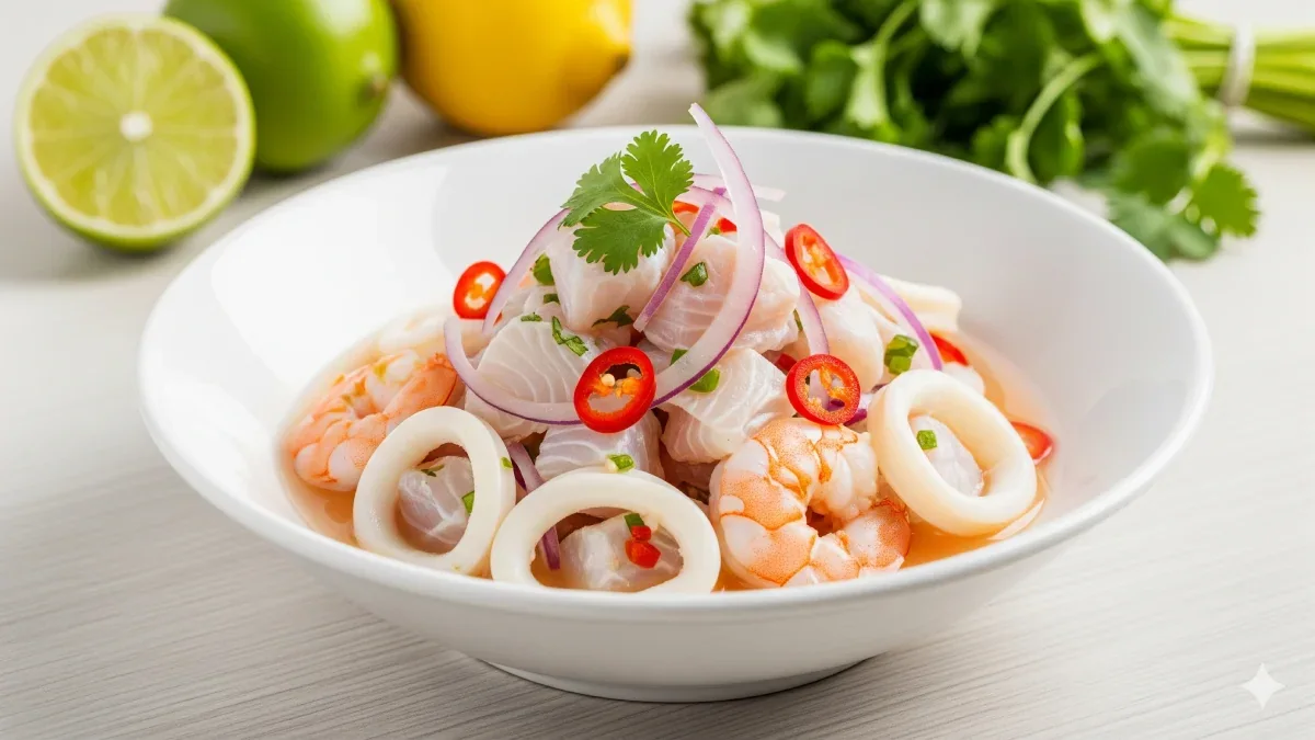 Existe algo mais refrescante que o ceviche? É um prato que transporta você para o litoral. Com o frescor do mar e um toque de acidez. O ceviche de frutos do mar é o clássico peruano. Um tesouro da culinária.
