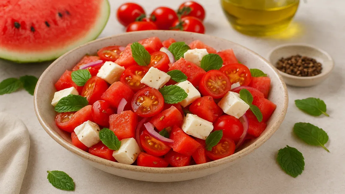A combinação de frutas frescas com queijos salgados é tradicional no Mediterrâneo. Essa salada é uma releitura moderna, inspirada em receitas gregas, onde o feta é amplamente usado em pratos de verão. A mistura de tomate e melancia já é tendência em cozinhas criativas pelo contraste doce, ácido e salgado.